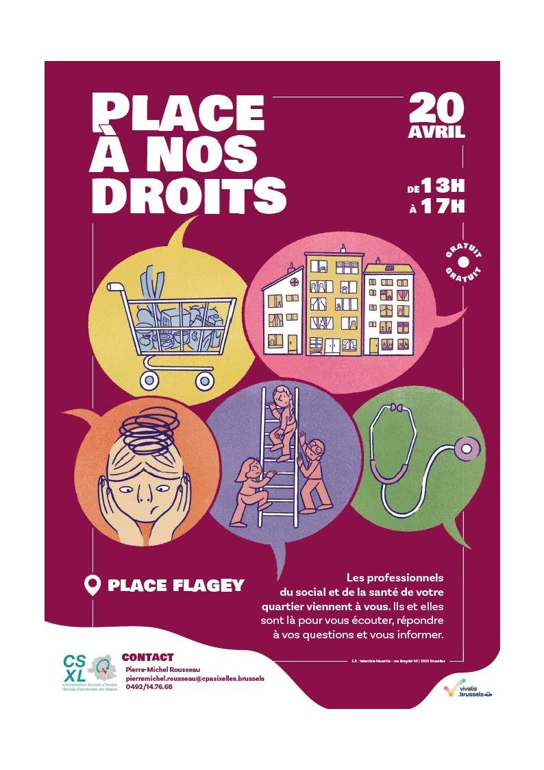 Op maandag 20 april 2026 nodigt de sociale coördinatie van Elsene, met steun van het team van de Zorgzone Zuid, u uit op het Flageyplein voor het evenement “Ruimte voor onze rechten!”.